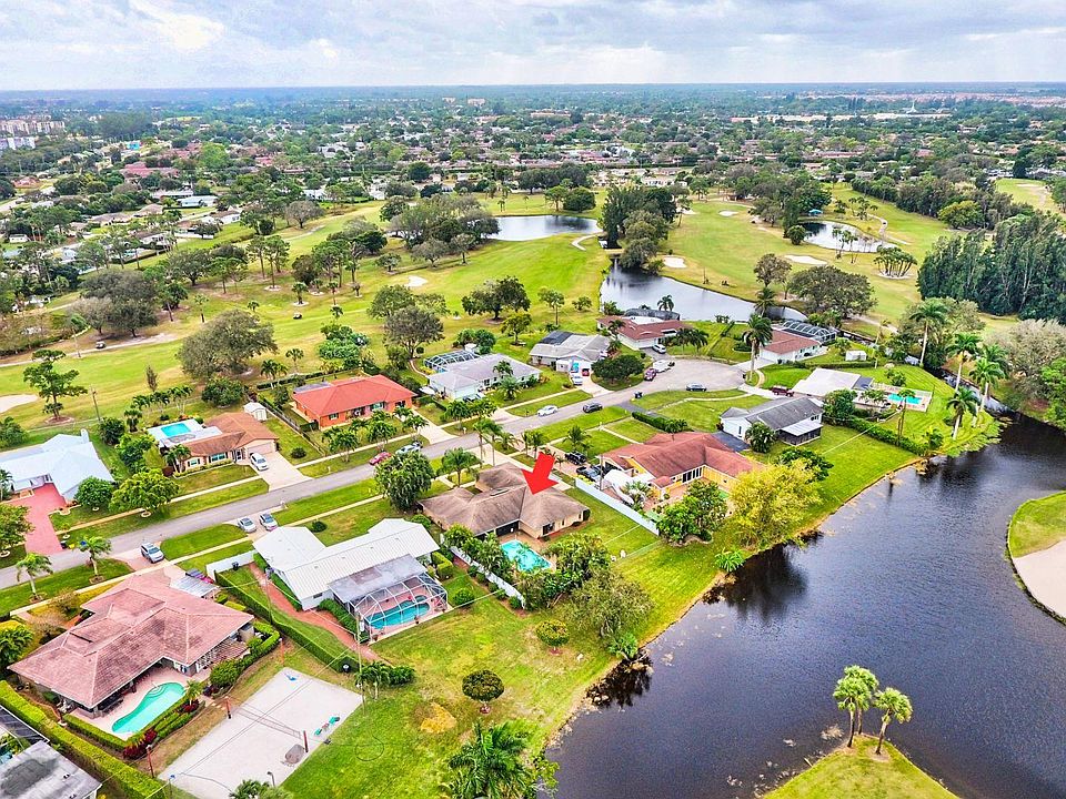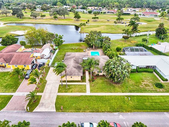 Ideally Located on the Palm Beach National Golf and Country Club with NO HOA FEE and no mandatory membership. This spacious four bedroom, two bath, split bedroom home with views of the golf course and lake. There is a large screened in patio off the living room family room and kitchen with views of the private inground pool and lake. Great layout from the double door entry way that leads you into the large living room/dining room. Open kitchen to family room and patio. New hot water tank, new pool pump/filter, newer sliding glass doors in the family room. Roof 2006. Large driveway with a carport and two car garage.