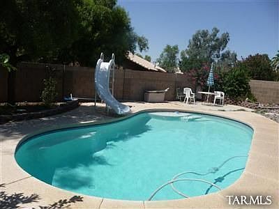 Wonderful, comfortable family home with oversized block walled yard, salt water pool, fruit trees, covered back porch. Refrigerator, washer/dryer included! Real wood flooring in living, dining & family room. Bay window in kitchen with room for table & chairs. French doors to patio. Established large shade trees & vegetation. 4 spacious bedrooms upstairs, 2 full bathrooms, 1/2 bath downstairs. Walking distance to park/rec center on Coachline.