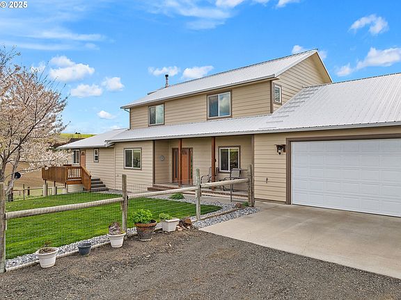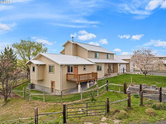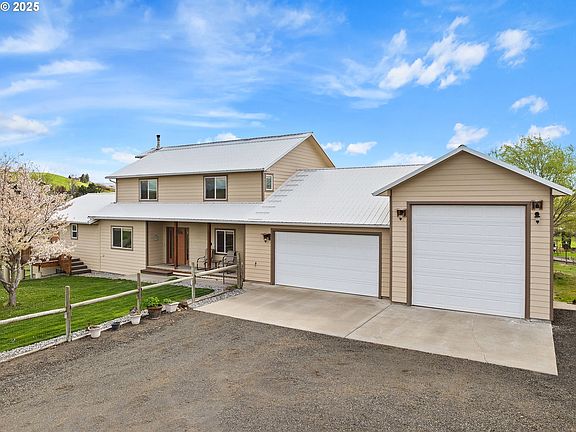 Perched up high on the outskirts of Pendleton, Oregon—famed for its rich history and Western charm—this remarkable 4-acre property combines country living with modern appeal and breathtaking views of the surrounding countryside. The living area includes the original 5 bedroom, 3 bath home (2524sqft) with a spacious 1 bed, 1 bath ADA compliant mother-in-law suite addition (832sqft) completed in 2017. Together, the home offers 3350+ sqft of living space, two beautiful kitchens, two master suites, and three separate decks to relax and enjoy the Eastern Oregon sunrises and sunsets. The property offers exceptional storage facilities and outbuildings including the large, insulated 1232sqft attached garage that accommodates 2 cars and an RV, a detached 864 sqft garage, insulated and large enough for up to 4 cars, a 36x36 barn with a loft and 1656sqft of space, and a professionally installed horse arena (110x60) designed with proper drainage and 3 inches of sand, ideal for riding and training. The geothermal ground-source heating and cooling system ensures year-round comfort with separate units for upstairs and downstairs — this system is truly the Rolls Royce of heating and cooling homes. The property also boasts a high-output well with both regular and solar-powered pumps, ensuring an abundant water supply, and a pump house with additional storage and firewood bays. A water softener and reverse osmosis system are set up to ensure pure and clean water throughout the house. An automatic gate for the long driveway adds additional security. The well-maintained grounds feature underground sprinklers and drip lines to keep the landscaping lush and healthy, and gutter guards have been installed to minimize maintenance on the house. With its combination of spacious living, equestrian facilities, and prime location outside of Pendleton, this property offers endless possibilities. Schedule your private tour today and experience this Pendleton gem for yourself!