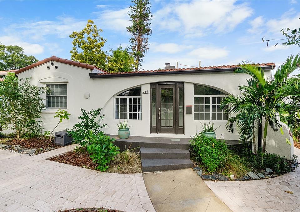 Step into timeless charm just steps from Crescent Lake Park. Located in a desirable non-flood zone, this beautifully maintained 1930s Spanish-style home offers 4 bedrooms, 3 baths, and over 2,000 heated square feet of character, updates, and flexible living space- all just minutes from vibrant downtown St. Petersburg and I-275. Perched slightly above the street and only one house in from the 56-acre Crescent Lake Park, the home enjoys serene lake views from its inviting enclosed front porch. Natural stone flooring and arched windows create the perfect spot for morning coffee or sunset unwinding. Inside, the stunning vaulted living room showcases original architectural drama with cathedral wood-beamed ceilings, a wood-burning fireplace, and inlaid hardwood and parquet floors. The spacious dining room sits just beyond and flows into the updated kitchen, complete with a charming arched entryway and newer stainless steel appliances including a gas range. Off the kitchen, a step-down family room/guest suite offers ideal flexibility with its own seating area, bedroom, and bathroom. Thoughtful updates ensure comfort and peace of mind while preserving the home’s historic character to include: tile roof (2021), new HVAC duct system (2021), updated wiring & panel box (2019), zoned central heat & air (2015), newer windows, efficient tankless water heater, newer kitchen appliances, washer and dryer. The property also features a private driveway, a deep single-car garage, cozy front porch, mature Florida-friendly landscaping, fenced yard, and attractive shellock pavers. Just 50 yards from Crescent Lake’s walking paths, playground, dog park, tennis courts, and pickleball courts, and a short walk or bike ride to Trader Joe’s, Rollin’ Oats, and an array of local restaurants and shops, you truly cannot beat this location. A rare blend of historic charm, modern updates, and one of St. Pete’s most treasured neighborhoods, this Spanish-style beauty is ready to welcome you home.