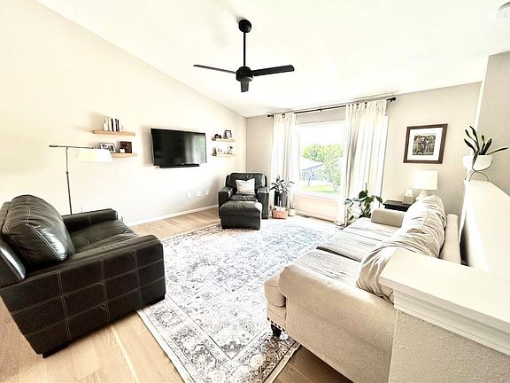 Wow! Beautifully updated three bedroom, two bath family home with two car garage. Vaulted ceiling throughout create a sense of openness and space. Freshly painted walls and new flooring make this house move in ready. Kitchen includes tons of cabinet space, pantry and additional breakfast bar. Master suite with ensuite bath has lots of storage. No need to worry about appliances all are included. Step outside onto the newly pour patio and enjoy the tree lined backyard! Located on a quite cul-de-sac. This is a must see!!!
