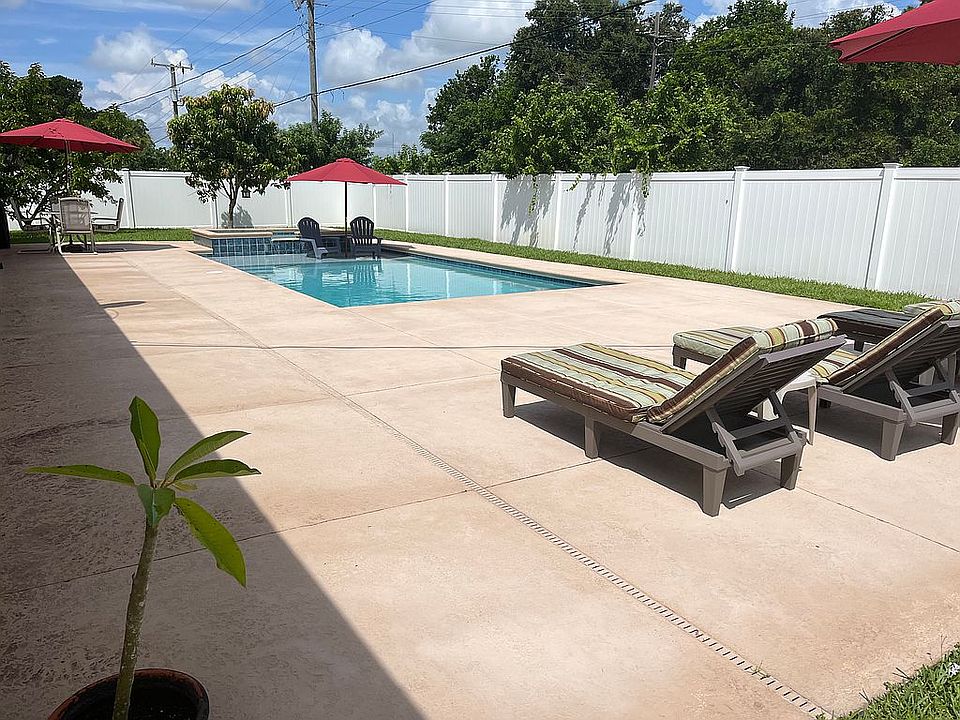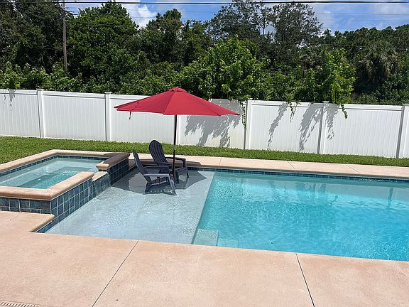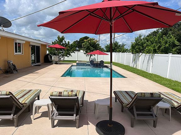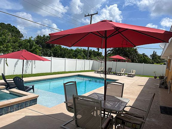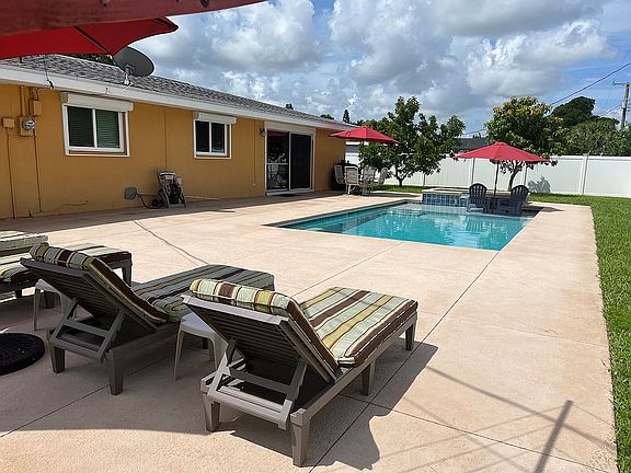 New New New!! Fantastic renovated home in northeast Palm Bay, FL. New kitchen, stainless steel appliances, maple cabinets. 18" tile throughout. HUGE 26' master bedroom. New double pane windows, new hot water heater, new irrigation pump, new pool with hot tub and beach-large pool deck, solar panels to offset electric cost