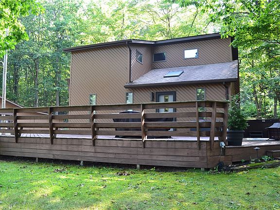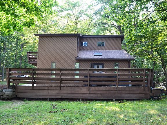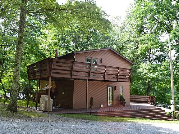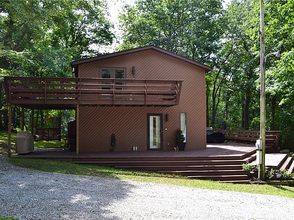 Country Bungalow in wooded setting! This 2 bedroom 2 bath home sits on 1 wooded acre with Extra Large Garage! This home feature large wraparound decking on main level and upper wraparound decking off the main bedroom, 1st floor bath has a shower , 2nd floor bath has a jet tub. Enjoy evenings on the wooden swings or entertain friends and family on the large wraparound front deck, Soak in the hot tub with a glass of wine. So much to enjoy in this cute Bungalow.