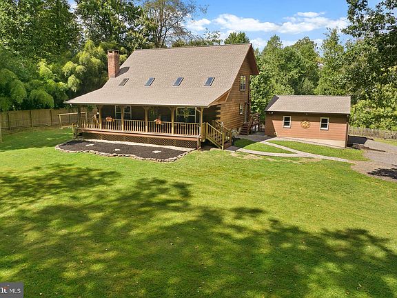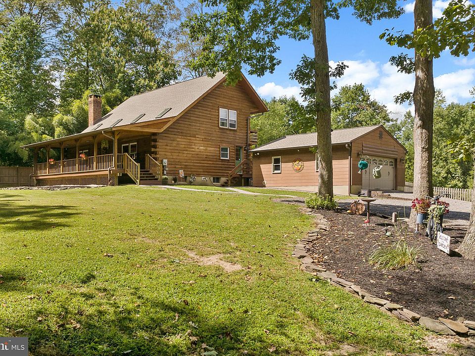 Nature Lover’s Dream: Custom Log Cabin Nestled on a tranquil 2.63-acre wooded lot that backs to preserved land, this custom log cabin offers breathtaking views, unmatched privacy, and a true escape from the everyday. From the moment you arrive, the welcoming front porch sets the tone for the warm, rustic charm that flows throughout the home. Step inside to discover a gourmet chef’s kitchen featuring radiant heated ceramic floors, a Viking range with hood on the center island, cherry cabinetry, stainless steel appliances, ample counter space, and a sliding door leading to a new stamped concrete patio —perfect for entertaining or enjoying peaceful mornings in nature. The bright living and dining rooms showcase soaring two-story open-beamed ceilings, skylights, and a floor-to-ceiling brick fireplace, creating a dramatic and cozy space to relax. The main floor includes the spacious master bedroom and a full bath with a charming clawfoot tub, while upstairs, you’ll find two generously sized bedrooms, each with its own private deck overlooking the serene backyard. A second full bath completes the upper level. The finished basement spans the entire footprint of the home, featuring high ceilings, abundant storage, and flexible space perfect for a second living area, gym, or recreation room. Additional features include: • Detached 2-car garage • Chicken coop & raised garden beds • Repaved driveway entry (2020) • New roof, skylights, gutters with guards (2021) • Two new Anderson sliding doors installed (2022) • Stamped concrete patio (2023) This thoughtfully updated home perfectly blends natural beauty with modern comforts, making it the ultimate retreat for nature lovers or anyone seeking a peaceful lifestyle.