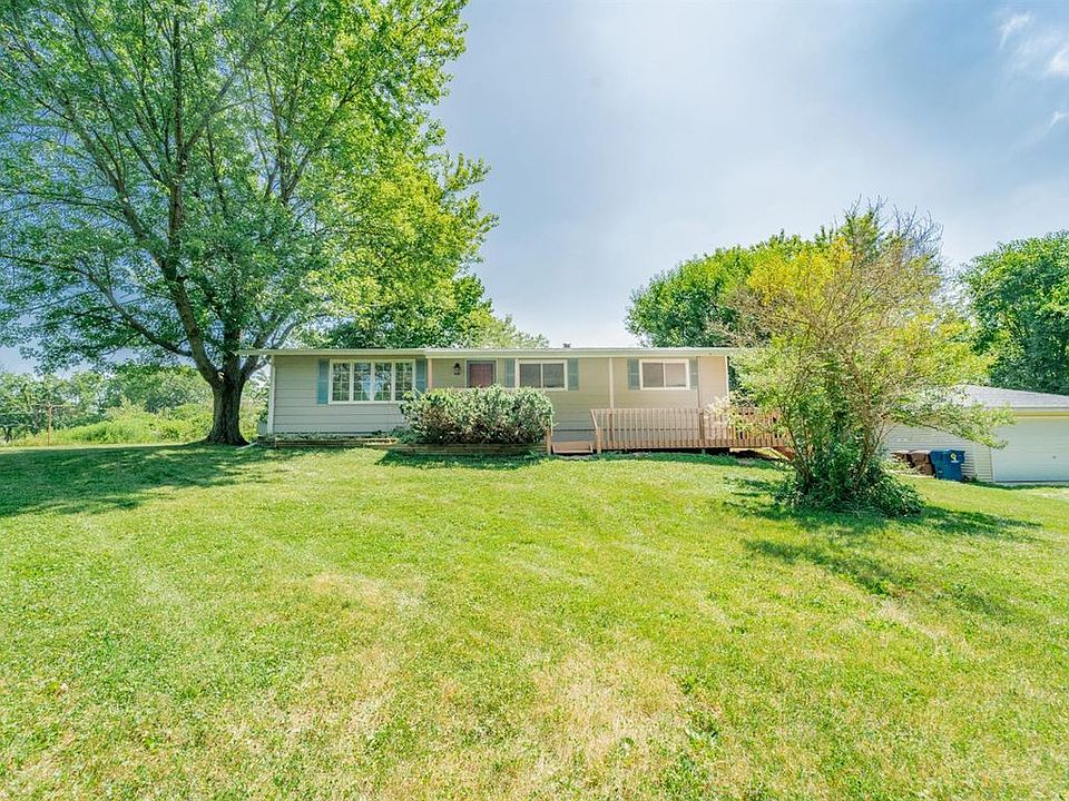 4 bedroom ranch with full walkout basement, covered porch, large deck in the front and back of the house and patio off the basement. Vaulted ceilings and skylight. Most rooms freshly painted and new carpet. Two and 1/2 car detached garage and shed with electric. Home needs updating but sits on Two beautiful acres. Very private and quiet. Liberty township, Duneland schools. Home is a modular. Bathroom has been updated.