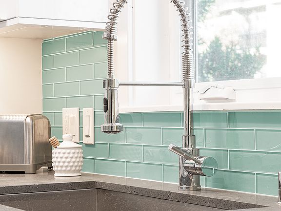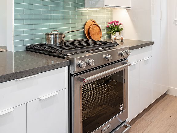 Glass tile backsplash, KitchenAid stainless steel appliances (refrigerator, a gas oven/stove with a stainless hood, dishwasher, quartz countertops, and a waterfall island/bar that flows into a spacious great room with pendant and recessed lighting that accommodates up to 3 stools to at the counter.