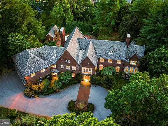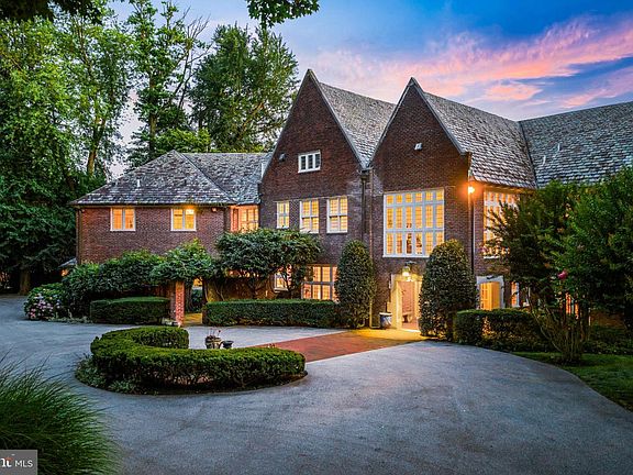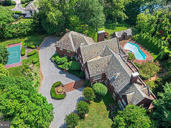 Set on 1.6 acres in sought-after Northside Villanova within Lower Merion Township, this 1924 red brick manor showcases timeless architecture with a slate roof, expansive leaded glass windows, and nearly 9,000 square feet of living space. Set back from the road, the approach is marked by a circular drive and a canopy of mature trees that frame the property with privacy. The entry vestibule opens to a dramatic foyer with wainscoting, leaded glass windows, and views through French doors to the rear terrace, flanked by the formal living and dining rooms. Natural light, hardwood floors, and detailed millwork set a welcoming tone, while a sweeping staircase with iron railings and a wood handrail rises to a landing with a built-in window seat —a striking first impression. The generously sized formal living and dining rooms reflect the home’s distinction with high ceilings, paneled walls, and carved limestone fireplaces; six fireplaces in total. French doors continue in nearly every room, extending to large terraces on the rear of the home. The living room opens into a bright sunroom with black and white checkered tile floors, an additional fireplace, while the dining room connects to an all-season room overlooking the rear grounds. Built-in bookshelves and glass-front cabinetry enhance the architectural character of the dining room, while a butler’s pantry, a cozy sitting room with fireplace, and a formal powder room complete this wing. The kitchen features soaring ceilings, a center island, granite countertops, and generous cabinetry, some with glass-front doors, as well as professional grade appliances. A built-in banquette is framed by two-story windows that provide abundant natural light. An open rear staircase leads to a large second-floor family room that overlooks the kitchen, with built-ins and high ceilings creating a natural gathering place. Next to the kitchen, a mudroom with entry to the garage and driveway adds convenience with an informal powder room, pantry, and coat closet. At the top of the main staircase, the primary suite commands its own private wing. This large room features paneled walls, hardwood floors, a marble fireplace, and windows framing both front and rear views. A light-filled dressing room connects to the ensuite bath. In the style of homes built in this era, a second primary bath with suana is found on the opposite side of the suite. This bath also opens Jack-and-Jill style to an office (which could be bedroom 6). The configuration continues as this room connects to an additional jack and jill bathroom and an additional bedroom. Off the center hall, two additional updated bedrooms offer ensuite baths. A spacious laundry room is conveniently located nearby. Through the 2nd floor family room, is an additional sitting room and adjoining bedroom also has an ensuite bath. It could serve as an in-law or au pair suite, or a homework room. In total the home offers 5/6 Bedrooms and 6 full baths. The lower level offers a large area with daylight windows, providing potential for future finishing. This level also includes a wine cellar and additional storage spaces. The rear grounds are designed for both recreation and relaxation, featuring an expansive terrace, an inground gunite pool and pool house w/ 2 bathrooms/changing rooms, washer/dryer, kitchenette. Also side tennis/basketball sport court. Mature trees and gardens frame the setting and provide privacy. A side entry attached garage has 2 bays. Located in the award-winning Lower Merion School District and close to many of the area’s private schools as well as renowned country clubs, the Villanova train station just one mile away, and I-476 for easy access to Philadelphia. 717 N. Spring Mill Road is a distinguished Main Line estate with enduring architectural presence. While cherished by the same owners for more than 20 years, it now offers the perfect canvas for new owners to personalize, blending timeless character with modern vision.