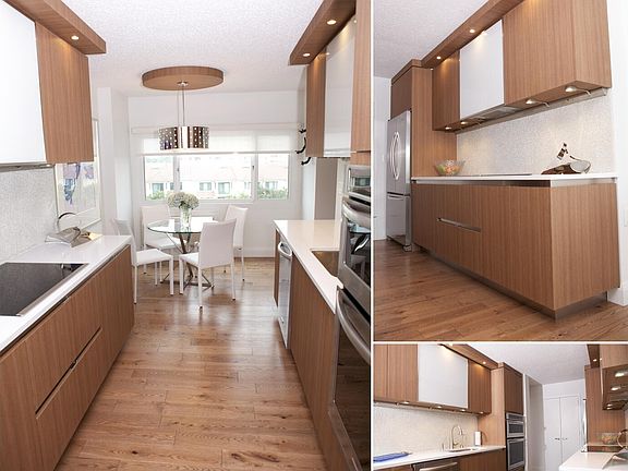 enjoys medium brown hardwood floors throughout the main living space, balcony w/ceramic porcelain tile floors off of living room overlooks the ocean, updated kitchen w/contemporary walnut cabinets, white glass mosaic backsplash, white quartz counters and adjacent breakfast room, spacious & inviting primary bedroom is complemented by a redesigned primary bath with 8-foot long shower and white quartz counters.