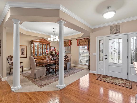 Elegant 1.5 story with 5 BR, 4.5 Baths, loaded with upgrades and space. Upon entry, the office/study has a vaulted ceiling with lots of natural light & the formal dining room is perfect for large dinner gatherings. The warm, sun drenched great room offers 11 ft ceilings, built-in bookshelves, a gas fireplace & a wall of windows. Kitchen island, 9 ft ceilings, double ovens, quartz countertops, gas stovetop, stainless appliances, tons of cabinet space and counter space & a built in desk with hardwood flooring are all open to the magnificent hearth room which also has a gas fireplace surrounded with beautiful stone. 1st floor master with coffered ceiling, 2 walk-in closets & a master bathroom with a vaulted ceiling, separate shower and tub, two vanities & ceramic tiling. 3 spacious bedrooms with walk-in closets, 2 baths and a loft upstairs. Rec room, 5th BR, bathroom, workshop, massive storage area on LL. Stamped patio, fenced yard, dual HVAC & so much more! Subdivision pool/amenities.