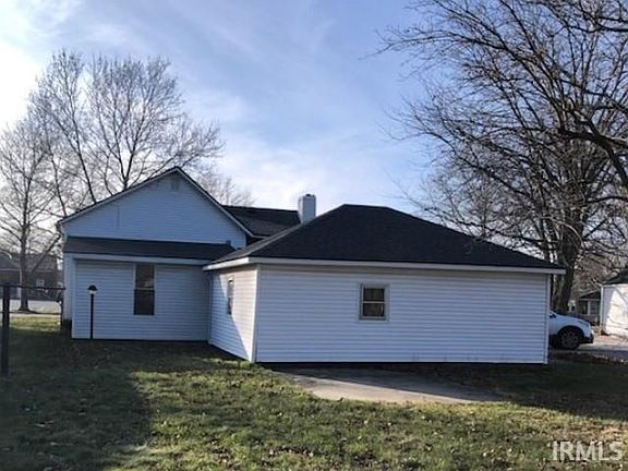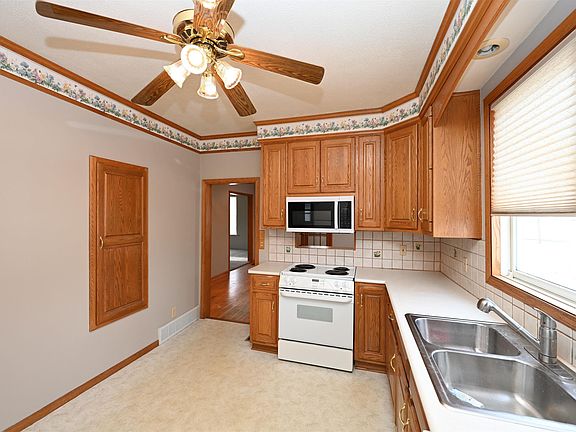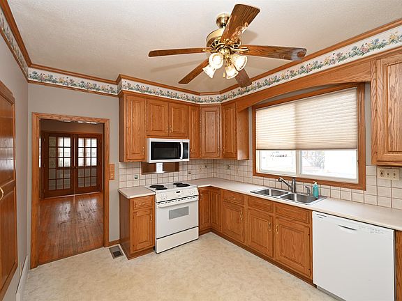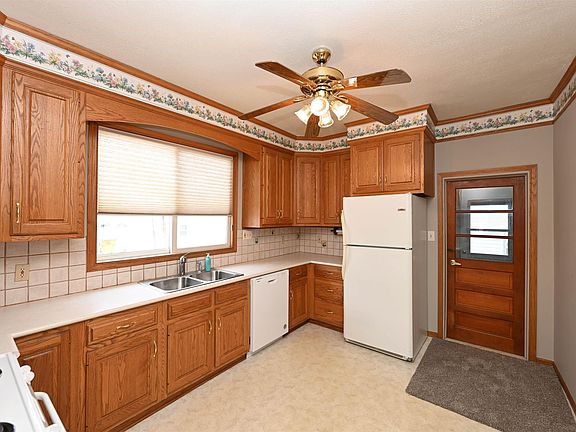 Immaculate and move-in ready, this delightful home offers three bedrooms and one and a half bathrooms, along with a detached 1.5-car garage. The spacious kitchen features custom oak cabinets that reach from floor to ceiling, and all appliances are included. Everything is conveniently arranged on a single level, with just a few steps from the garage to the back door. The dining room showcases original oak flooring and has French doors that open to an additional living area, ideal for an office or a toy/hobby room. The main bathroom has been recently renovated, featuring a new tub/shower combination, toilet, and vanity. This charming home is located just a few blocks from the school, town park, downtown area, and walking trail.