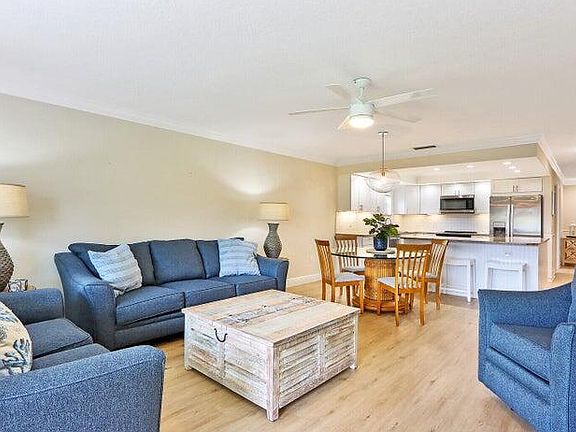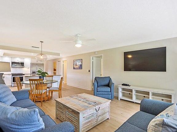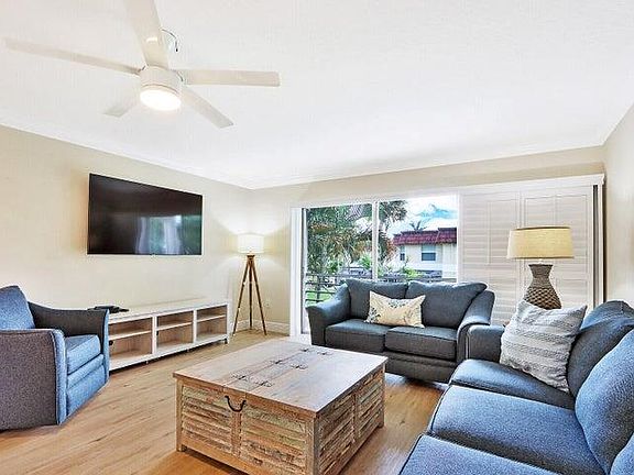 Annual Furnished Rental - $3,500! Perfectly Furnished 3 bedroom, 2 bath, 2nd fl condo available for annual lease. Renovated kitchen for open floor plan, stainless steel appliances, granite counters, vinyl flooring throughout with both bathrooms upgraded as well. Access to screened lanai from Main Bedroom and Living room to enjoy the garden view. Main bedroom has a king bed, 2nd bedroom has a queen and 3rd bedroom has 2 twins. Villas on the Green has a heated pool, tennis courts and private entrance to Carlin Park and the heart trail. You just need to bring your suit and flip flops so you can walk to the beach.