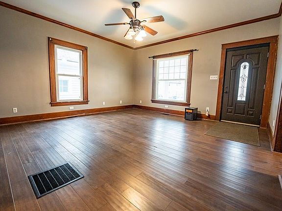 Take a look at this stunning and spacious four-bedroom, two-bathroom home near downtown Greenfield. The exterior masonry work along with the columns and rounded steps add to the grandeur of the curb appeal. The large living room and dining rooms flow toward the back of the house to the sunroom, giving you plenty of room for your large family or for entertaining. Downstairs you will also find the guest bathroom and two of the spare bedrooms. Upstairs is the third spare room and master bedroom with two walk-in closets. Relax in the huge, jetted tub after a long day! The upstairs landing would make a perfect spot for an office area or a reading nook. New flooring and new dimmable light fixtures have been installed as an added bonus! The detached garage is separated into two sections, one could be used as a workshop or mancave leaving plenty of room in the second section to be used as a garage or for your storage needs.