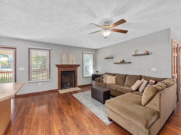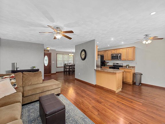 What a find in the Freeburg School District! Well-appointed ranch with finished, heated side-entry garage on nearly a half acre. Bonus 22x20 detached garage has a concrete floor & electric perfect for extra storage. Inside you'll be greeted with a light & bright open floor plan sporting laminate flooring and the gas fireplace is a focal centerpiece. Separate dining ideal for entertaining. Efficient, galley kitchen offers a breakfast bar, plenty of maple cabinets & counter space, and the stainless steel appliances stay. Breakfast room overlooks the 16x14 covered deck and yard with playhouse. Sought-after split bedroom floor plan. Primary suite sports large walk-in closet with luxury bath, jetted tub, separate shower, & linen closet. Two ample-sized bedrooms with roomy closets flank the main-floor full bath. Laundry room has cabinets and handy mud sink. The lower level is set up to host events with a game area and dry bar, family room, full bath, office/bonus sleeping, and storage room.