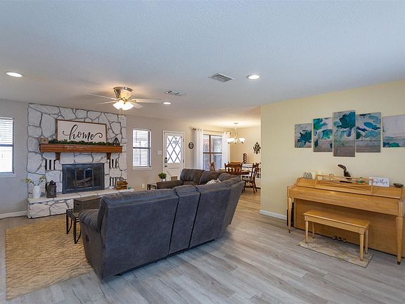 Nice curb appeal! Spacious rooms with open floor plan & split bedrooms give privacy. Fireplace has gas starter. Living room with laminate flooring, new tile in laundry room, carpet in bedrooms. New recessed lighting in common areas. New lighting fixtures in other rooms. Master-en-suite has separate double sinks, renovated shower, and a huge walk-in closet. HUGE fenced backyard.