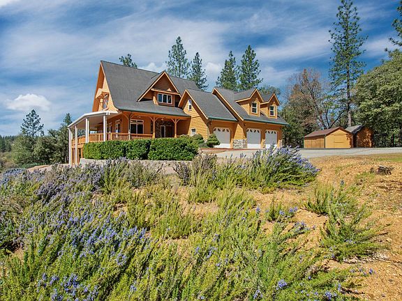 This stunning, custom-built cedar home is situated on a sprawling 2.5 acres of breathtaking Sierra Foothills terrain. Immaculately maintained and offering both seclusion and stunning views, this home boasts 3 upper level bedrooms, each with its own luxurious full bathroom. A generously sized space above the garage has been converted into a potential 4th bedroom/office area and includes its own half-bath. The open floor plan and two cozy fireplaces create a warm and inviting atmosphere, while the wraparound covered deck offers unobstructed views of the surrounding tree lines. The lower level of the home features a spacious great room complete with a full bar and an additional fireplace, providing plenty of room for entertaining. This versatile space also offers the potential for a home theatre, and opens out onto the covered patio area. The property itself features useful storage sheds, a reliable back-up generator system, and a garden area dotted with beautiful trees. For the more adventurous members of the family, there are even zip-lines available for thrilling entertainment. Ready for immediate move-in and designed for both peace and tranquility, this beautiful home is an exceptional opportunity to embrace a luxurious lifestyle in a truly breathtaking natural setting.