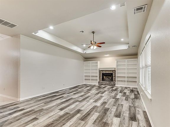 Step inside to discover the vaulted ceiling in the foyer-such a nice detail, luxury vinyl plank flooring throughout most rooms, and stunning tray ceilings in nearly every space—a rare and eye-catching detail. The living room features a cozy gas fireplace and built-in bookshelves, creating the perfect spot to unwind.