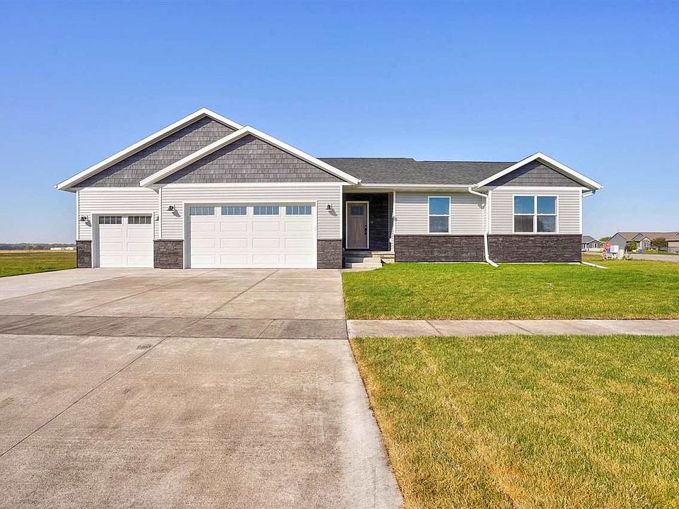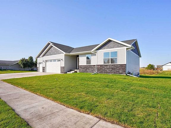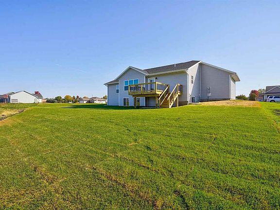 Spacious open floor plan in this 4-bedroom, 3-bathroom new construction home built by Zook Builders! From the formal entry way, step into the great room with cathedral ceiling & a large set of windows overlooking the farm field. Clean kitchen features white cabinets with soft closing doors/drawers, under cabinet lighting, white quartz countertops, white subway tile backsplash, deep undermount sink, breakfast bar, pantry, & stainless-steel Whirlpool appliances. LVP flooring throughout the great room, kitchen & dining area. LED lighting throughout with dimmer switch in the great room. Private master suite with a walk-in closet & full bathroom featuring a soaking tub with tile surround & vanity with soft closing drawers/doors. Two other bedrooms with ceiling fans & an additional full bathroom with bathtub on the main level. Open banister on the wide staircase leading to the finished lower level. In the lower level you will find a large family room & a wet bar/kitchenette area with cabinets, double sink, LVP flooring & space for a table. Finished 4th bedroom & large 3rd full bathroom w/ a walk-in shower. White trim, 3-panel mission style doors, & black hardware/accents throughout. Conveniently located 1st floor laundry room w/ cabinets & a large coat closet. Deep 3-car garage w/ space for a workbench. Large wood deck w/ black spindles & stairs down to the yard which looks out at the Iowa countryside!