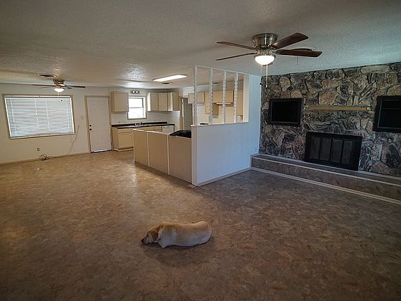 Open living room/kitchen area with fireplace.