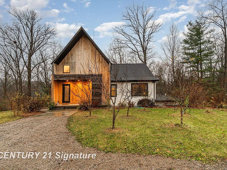 A Scandinavian inspired Custom-Built Home by Geiersbach This stunning home offers three, potentially four bedrooms, and boasts a host of high-end features. The entry-level showcases, high-end engineered wood floors and a spacious primary bedroom with an ensuite, including a luxurious tiled walk-in shower. Two additional generously sized bedrooms are also located on the main level. A sleek, modern staircase leads to the lower level, where you'll find an open floor plan designed for entertaining. Heated engineered wood floors. The living area and kitchen offer breathtaking views of the Tobacco River, complemented by professional-grade appliances and a home theater with built-in speakers. A tiled half-bath completes the space. Step outside onto the covered concrete patio, complete with an outdoor kitchen fully equipped with cooking appliances. This home features two gas fireplaces, a stackable laundry unit on the entry level, and a versatile loft space that can serve as an office or bonus room. A gravel road provides convenient access for kayak enthusiasts to the river. For additional space, the property includes a 4-car garage, perfect for vehicles and boat storage. There is also a separate 800-square-foot finished studio apartment with a living room, kitchen and bathroom, —ideal for hosting guests. The property is a dream for a nature lover, featuring a chicken coop, a 35-tree fruit orchard, and plantings of blackberries, blueberries, raspberries, strawberries, asparagus, and grapes. Relax by the river with your very own beach area. This extraordinary property offers a unique blend of luxury, functionality, and outdoor living.