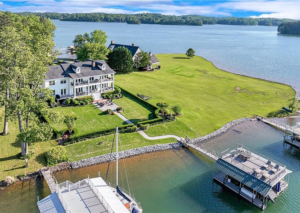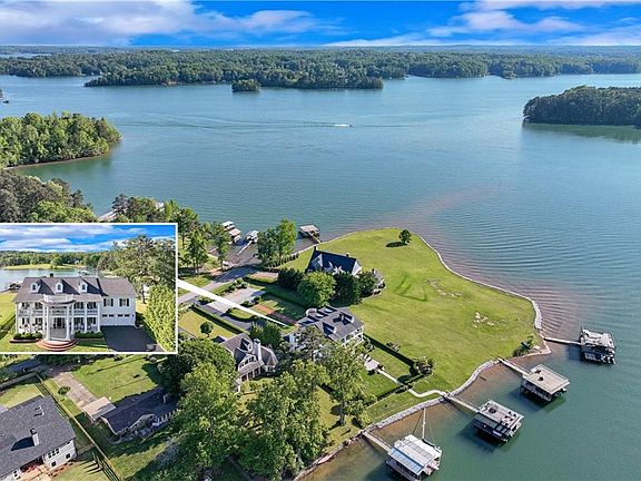Southern coastal living meets lakefront luxury in this spectacular gated home on Lake Lanier. Live the lifestyle you've been dreaming of! Situated on a quiet peninsula street in the sought-after Six Mile Creek area, this one-of-a-kind property offers 270-degree stunning water views and a rare, level, grass-to-water lot. The CORPS line is IN the water, allowing full use of the fenced backyard right to the beautiful rip rap shoreline. Enjoy over 1,900 square feet of covered outdoor living across four spacious covered porches, with breathtaking sunrises or sunsets from every room. French doors in every space, including ensuite bedrooms, open to covered verandas for seamless indoor-outdoor living. Just steps from the home, a private 32'x32' twin-slip dock with party deck awaits your boats and jet skis! Equipped with a boat lift, jet ski ports, and irrigation pump for irrigating to the yard, making lake life easy. Entertain or relax from the upper party deck enjoying nightly sunsets. Inside, the home features a grand two-story marble foyer, soaring ceilings, hardwood floors, detailed millwork, and updated lighting. The main level includes a formal dining room, home office or media room, and an open-concept great room with gas fireplace that flows into a chef's kitchen with a large island, Wolf professional range, and SubZero refrigerator. French doors lead to a covered porch with automatic remote control screens. There are two primary suites, one on the main level and one upstairs-plus three additional private ensuites, a guest suite, and a spacious bonus/bunk room share a full bath. A gathering room with wet bar and porch access is perfect for relaxing. Additional highlights: oversized garage with half bath, whole-house generator, security system with cameras, two tankless water heaters, foam insulation, natural gas, and Forsyth County senior property tax exemptions available at age 65.