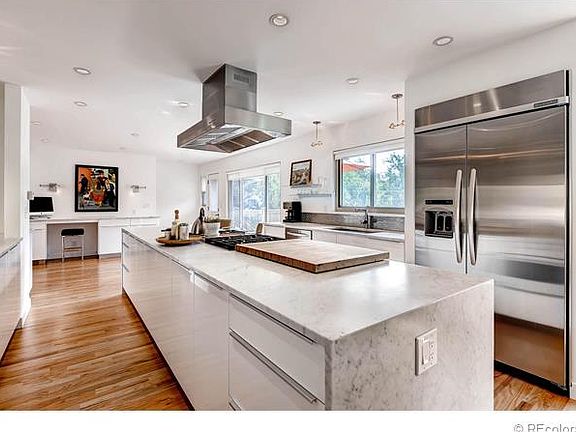 Say hello to this one of a kind, 1960 ranch that brilliantly materializes into the current day, with limitless style and design throughout. A dazzling open floor plan is anchored by the gourmet kitchen with its sleek white cabinets, honed Carrera marble counters, KitchenAid commercial appliances, 48-Inch gas range, 42 inch built-in refrigerator, a honed marble waterfall edge on the 13-foot island, Perlick wine/beverage center, custom lighting & office area all crafted to add high design & function to this ultimate entertainment & family-oriented space. A lower Mother-in-Law Suite & Mondrian inspired patio w fireplace is perfect for after dinner drinks & campfire fun. A wide hallway, that includes ample storage and laundry facilities lead to the upper 3 bedrooms & Large main bath with heated floor. The master suite has a custom walk-in closet, elegant white tile, honed marble master bath with steam shower & vanity area.