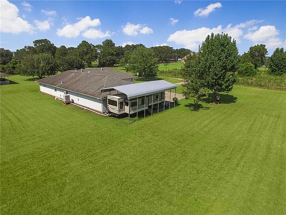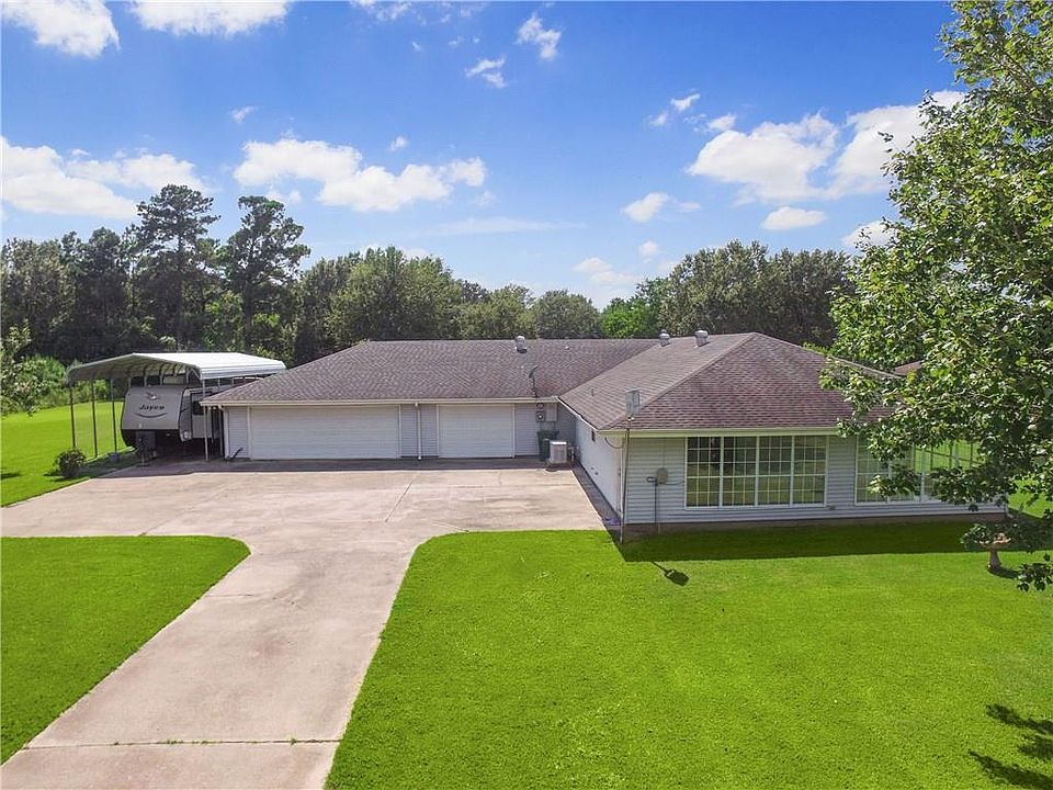 This wonderfully open and sun-filled home sits high in flood zone x and features a propane-powered generator! Enjoy nearly an acre and a half of country life with RV parking area, and three garage bays for wonderful storage and space. The home features all hard surface flooring for easy up-keep. An entertainer's delight, the big windows have a view of nearby Moss Lake. Huge laundry room & master bath. Make your appt to day to come see this unique home! All measurements are more or less. Post hurricane work happening at the home post hurricane: windows, siding, gutters, roof, some ceilings, some sheetrock, tree removal and RV cover to be re-built.