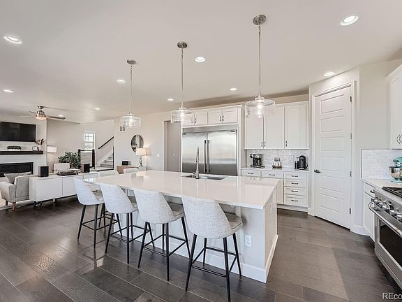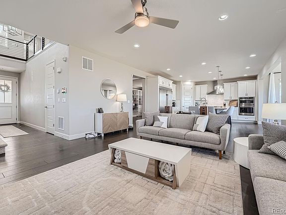 Welcome home! This stunning former model home is perfectly situated on a spacious corner lot and backs to open space & trails. This exceptional residence boasts a wealth of high-end finishes that exemplify luxury living. Step inside to discover a thoughtfully designed floor plan that seamlessly combines style and functionality. The main floor features a sophisticated office with custom built-ins, providing a perfect space for working from home or pursuing personal projects. The heart of the home is a grand living area with expansive windows that invite natural light and offer views of the adjacent open space. The gourmet kitchen is a chef's dream, equipped with top-of-the-line appliances, elegant countertops, and a generous island perfect for casual dining and entertaining. The adjacent dining area creates an ideal environment for hosting gatherings. Retreat upstairs to find a sprawling loft area, perfect for relaxation or additional recreational space. The upper level also includes a convenient laundry room and an inviting ensuite bedroom, ideal for guests or family members who value their privacy. The luxurious master suite is a true haven, featuring a super-sized shower that adds a touch of spa-like indulgence to your daily routine. The additional bedrooms are generously sized and thoughtfully designed to provide comfort and privacy for everyone. The finished basement adds valuable living space, offering endless possibilities for customization. This former model home is a rare find, showcasing impeccable upgrades and modern amenities in a highly desirable location. You’ll love the proximity to Altitude Elementary, and one of two community centers is just a short stroll away. For weekend relaxation or outdoor adventures, the Aurora Reservoir is conveniently close. Don’t miss the opportunity to make this exceptional property your own and experience the unparalleled luxury and comfort this home has to offer!