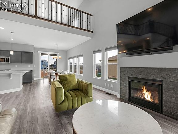 This like-new home in Banning Lewis Ranch offers an abundance of space and modern comforts. The open floor plan seamlessly connects the living room, dining room, and kitchen, all unified by easy-maintenance LVP floors and a neutral color palette. The two-story living room boasts a cozy fireplace and great natural light. The chef-worthy kitchen features ample gray Shaker cabinetry, a desirable 5-burner gas range, a white front panel refrigerator that complements the white countertops, and an expansive center eat-in island. A walk-in pantry provides extra storage. The main-level primary bedroom retreat includes quality features with a tray ceiling, and a large walk-in closet. The primary 5-piece en-suite offers a large walk-in shower with a bench seat and an oversized tub. The mudroom with built-in bench and laundry room are conveniently located off the garage. An additional main-level bedroom is perfect for guests or a home office. Upstairs, you'll find a bright and sunny versatile loft, an additional spacious bedroom, and a bath. The basement includes two more bedrooms and an expansive family room that can easily be divided into separate spaces. The maintenance-free private backyard and partially covered back patio provide outdoor relaxation. This home is in a great location, minutes from the Banning Lewis Ranch pool and dog park, with quick access to dining, shopping, and major roads. This move-in-ready gem is a must-see. Some vrtually staged photos used in this listing.