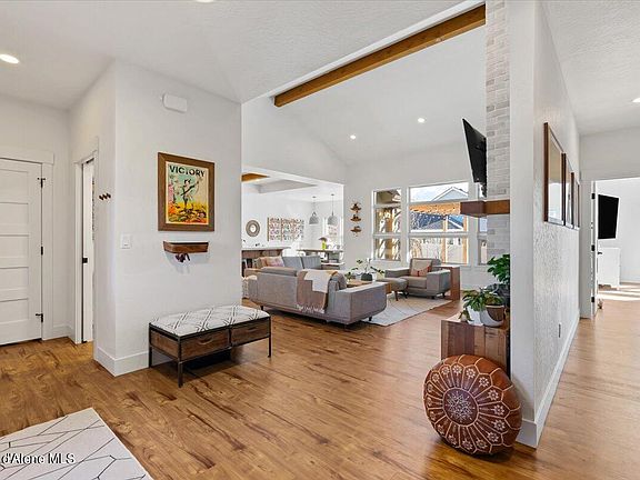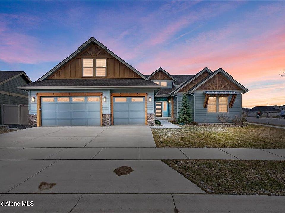 No detail missed on this CdA Place rancher on a large corner lot! This open floor plan features main floor living on over 2,800 sq. ft, 4 bedrooms (or 3 bedrooms plus an office) /3.5 bathrooms plus a large upstairs bonus room over a 3 car garage. Upgrades throughout include LVP wood floors, floor to ceiling brick fireplace, cedar beam accents & gourmet kitchen. The gourmet kitchen features stainless steel Bosch appliances, farm sink, large walk in pantry, & cedar beam shiplap accents. The private master suite has vaulted ceilings, dual vanities with quartz countertops, and an oversized walk in tile shower with dual shower heads. The Jack/Jill secondary bedrooms has quartz vanities and tile shower. The south facing backyard has a large back patio with custom pergola, storage shed, and fire pit area. Enjoy all that Coeur d'Alene Place has to offer with easy distance to schools & dining & coffee shops with miles of trails and a multiple parks located within the neighborhood!