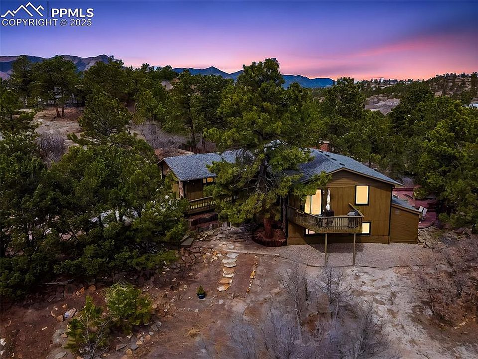 Nestled in a cul-de-sac on nearly an acre of pristine woodland with a plethora of natural wildlife, in prestigious District 20, this stunning 5-bedroom, 4-bathroom custom home offers the perfect blend of luxury and natural serenity. The property's flag double lot features majestic pines and oak trees, creating a peaceful retreat just minutes from I-25 and top shopping destinations. Step inside to discover a grand living room anchored by a cozy wood fireplace, flowing seamlessly into a chef's kitchen with granite countertops, premium gas range, double ovens, and built-in refrigerator. The main level includes the primary suite and another bedroom, a full bath, and elegant formal dining room. The lavish primary suite is a true sanctuary, complete with a gas fireplace, spa-like bathroom featuring a walk-in shower and soaking tub, and a sprawling custom closet. Access to the deck and backyard, where you can enjoy the tranquil wooded views. There is also a dog run and fenced yard. The finished lower level offers versatile living space with two more bedrooms, and a second primary suite (easily convertible to a sixth bedroom), and a spacious laundry room with utility sink. The family room offers plenty of space for entertainment with a third fireplace. A walkout basement with easy access to the sauna, deck, outdoor fireplace and landscaped , irrigated area with garden. With its exceptional craftsmanship, premium location, and rare double lot, this is a once-in-a-lifetime opportunity in Rockrimmon. This meticulously maintained estate combines privacy, luxury and convenience in one of Colorado Springs' most desirable neighborhoods. Schedule your private showing today!