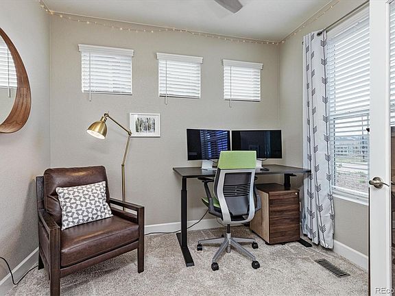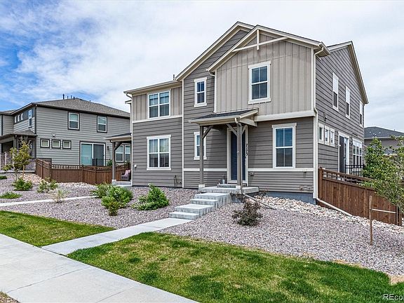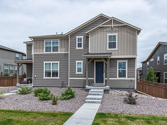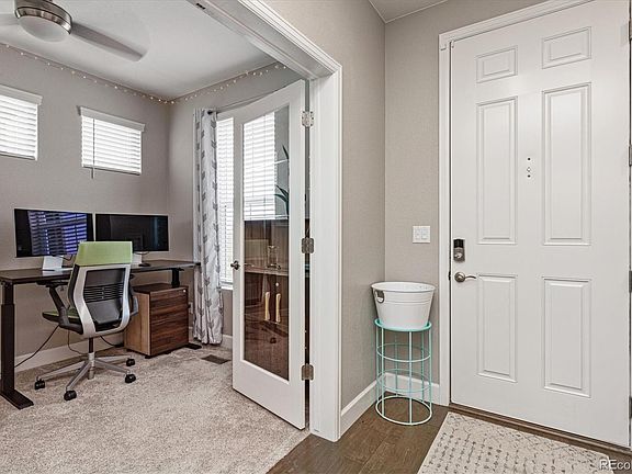 This beautifully appointed two story paired home is move in ready, featuring 3 bedrooms upstairs, a main floor office and private fenced yard! Welcome inside from the charming front porch to engineered hardwood floors that extend throughout the main level of this popular floorplan with plenty of ambient light. The open layout is ideal for comfortable daily living and entertaining with a large living room that flows perfectly with the dining room and kitchen. Abundant shaker style cabinets boast crown molding, roll out shelves at the lowers and a generous island with bar seating plus there is a walk-in pantry for additional storage. The under cabinet lighting highlights the Quartz countertops and subway tile backsplash that compliment the stainless steel appliances that include the gas range, microwave, dishwasher and refrigerator. Dining room provides sliding door access to the fenced yard with extended patio where you can enjoy your favorite beverage. French doors at the office afford you privacy to work from home with the main level powder bath nearby. Attached two car garage offers a high ceiling and storage space under the stairs with a thoughtfully placed mud room inside the service door. The spacious primary suite hosts a sitting area, large walk-in closet and private bath 3/4 with dual sinks and Quartz countertops at the kitchen height vanity. Secondary bedrooms utilize the full hall bath and laundry is conveniently nearby. The unfinished basement has room to expand and has rough in plumbing. You will appreciate the HOA maintained front yard with sod, one shared wall, energy saving features, LED lighting, central air, humidifier, video doorbell and security system. Castle Valley in Lagae Ranch features two parks and a playground in a great location near schools, grocery stores, shops and a short distance to I-25!
