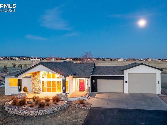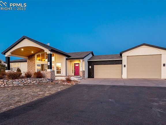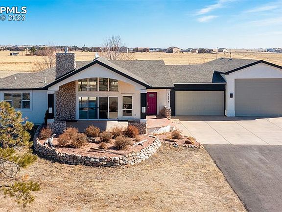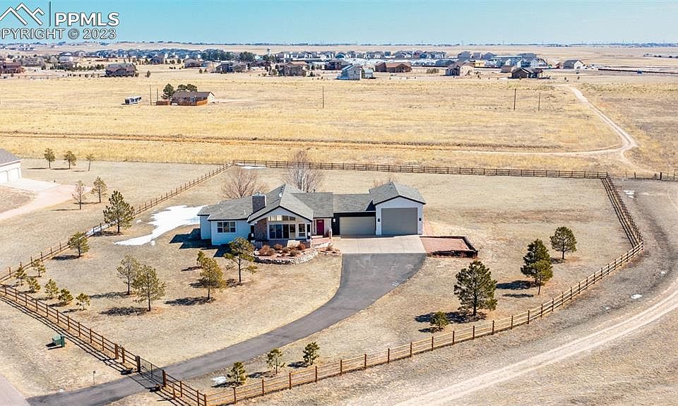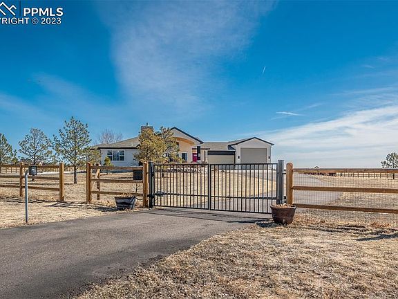 Incredible opportunity to own this ranch-style home on 2.5 premium acres of horse zoned land with STUNNING panoramic Pikes Peak and Front Range views! Full perimeter fencing (safe for animals) with a newer electric privacy gate. Upon entry, you'll be greeted by a newly updated open floor plan with a grand stone surround fireplace and new luxurious laminate floors. Superb natural light flows in from the high vaulted ceiling windows and an oversized sliding door that opens to a striking tongue and groove covered patio, perfectly positioned for those one-of-a-kind views. The wood accents carry on inside along the living room and dining room walls. Gorgeous chef-worthy kitchen with new high-end Bertazzoni appliances, ample soft gray and white cabinetry, and granite countertops. Main-level primary retreat with new carpeting, new spa-inspired 5-piece en-suite with dual vanities, enormous walk-in closet, and a sliding door to the serene backyard. Massive laundry/mud room off the garage with utility sink, powder room, & extra storage closet. An additional main-level bedroom & three more in the lower lever provides plenty of space for guests. A lower-level family room with spacious wet bar is perfect for entertaining. 4-car+ insulated garage with space for a large RV! Newly landscaped backyard. Additional new updates include: lighting, electrical, fresh exterior paint on house, tongue and groove wood overhangs on front and back patios, insulation in RV garage, custom railings inside and out, turnaround off driveway, backyard privacy fencing, and new ceiling fans. Peaceful backyard with trails behind the lot. Fantastic Silver Ponds community where neighbors take pride in their homes & care for one another! 2 private ponds for fishing as well! You'll love the feel of country living with the conveniences of the city only minutes away in this move-in-ready gem boasting one-of-a-kind views and a warm and welcoming feel you just can't live without! 3 Virtually staged photos.