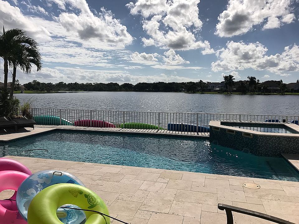 Welcome to the best single story pool home in Lake Charleston! 3/2 + office. Panoramic lake views, heated saltwater pool + spa hot tub controlled via mobile app, marble travertine deck, covered patio, and southern exposure makes this the best house for outdoor fun. Inside is open concept floor-plan, full of natural light, upgraded designer kitchen, huge family room wired for 7.1 surround sound, large dining area and separate home office. Split bedroom plan w/ French door entry to the large master suite, walk in closet and brand new master bath with double vanities, frameless shower and separate tub. Down the hall are two more bedrooms, a guest bath and separate laundry room and attached 2 car garage. 10 foot ceilings, neutral painted, and hardwood floors throughout. Great for kids: double cul-de-sac and A-Rated schools (Manatee, Christa McAuliffe, Park Vista). Cable, Internet, Lawn Service and Pool Service included! Tenant pays for electric and water. Max 2 smaller pets allowed w/ additional fees.