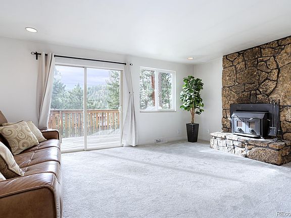 This 3 bed/2 bath home is nestled in a quiet neighborhood in Evergreen with no HOA. You'll spend an endless number of nights on the deck with gorgeous mountain views. Once the sun has set countless stars will greet you while you are roasting marshmallows and relishing the cool Colorado evenings. Situated on a .86 acre lot with a storage shed there is plenty of room to add a garage and hang a hammock to enjoy warm summer days between all of the trees. This home is perfectly situated between Evergreen and Conifer and the Lower Maxwell Falls is a short walk down the road. Once inside you'll find new carpet on both levels. On the upper level, you'll love the open living space between the living room and kitchen and abundant natural light. In addition, there are 2 bedrooms, a full bath, and a dog door located off the kitchen that opens to a dog run. The wood fire stove is perfect to keep your house warm on a snowy night. On the lower level, there is a bedroom, 3/4 bath with gorgeous tile floor, a bonus room, laundry, and storage room. The zoning allows for chickens and you'll love your south-facing driveway in the winter. This home is on public water and has a septic tank.