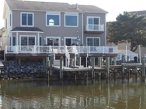 CUSTOM BUILT WATERFRONT...in perfect condition...Bright, ''open design''.... Recently remodeled GOURMET KITCHEN boasts granite countertops, stainless steel appliances & a huge pantry.. The FIRST FLOOR MASTER SUITE has also been recently remodeled..with new bathroom and hardwood floors...There is a SECOND MASTER SUITE on the second level..as well as two other generously sized bedrooms.. And finally, a media room (or fifth bedroom)...Closets custom designed throughout for maximum storage... A HUGE WATERFRONT, MAINTENANCE FREE DECK leads you to a fabulous pier setup. TWO 8000 lb. lifts...for your boat and jet skis. All of this is situated on a wide, deep canal..with direct access to the bay.