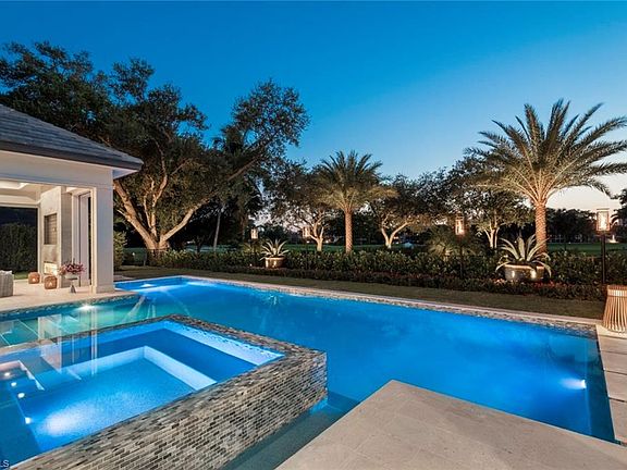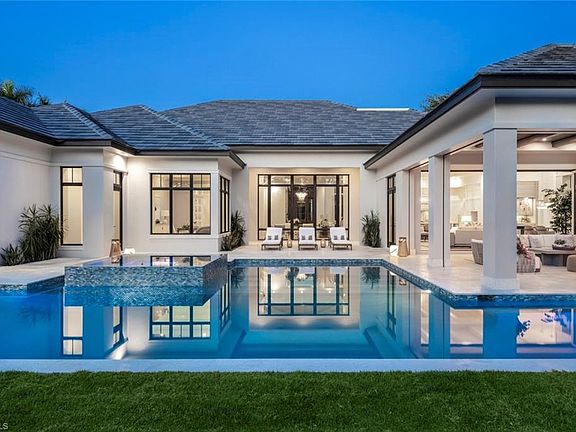 Please call Taber Tagliasacchi at 239-287-0777 for inquiries. A masterpiece of gracious indoor/outdoor living, this SW exposure estate home is defined by its expansive living space, adjoining 50' resort style pool, and stunning backyard with 180° lake and golf course views. 20' glass walls and floor to ceiling windows frame beautiful vistas in every direction, flooding the home with natural light. Wide plank European oak floors are perfectly complemented by imported hand knotted area rugs scattered throughout this open concept coastal chic retreat. One of numerous custom upgrades, the walnut 800+ bottle wine vault provides a stunning focal point upon entering the home. Perfect for entertaining, the spacious custom kitchen and Butler's pantry provide a beautiful and functional chefs domain for cocktails and dinner parties under the stars. Designed by Stofft Cooney, built by Knauf-Koenig, finished and furnished by Calusa Bay Design with the highest quality finishes, systems and appliances, this 6,000 SF smart home offers every upgrade imaginable, all within walking distance to Artis-Naples, Waterside Shoppes, and 2 private Pelican Bay beach clubs. Pelican Bay is the hottest up and coming redevelopment location in Naples, and the only community in Naples with 3 miles of deeded beach, an active tennis program, and 27 holes of golf with a stunning brand new clubhouse. This private, gracious, inspiring home is a "must see" for the discerning Buyer.