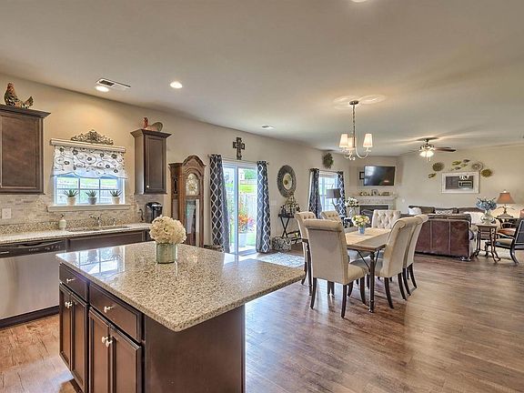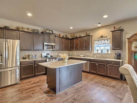 - RoomKitchenFeatures: Granite Counters, Kitchen Island, Pantry, Recessed Lighting, Eat-in Kitchen, Floors-Hardwood, Cabinets-Stained, Backsplash-Tiled