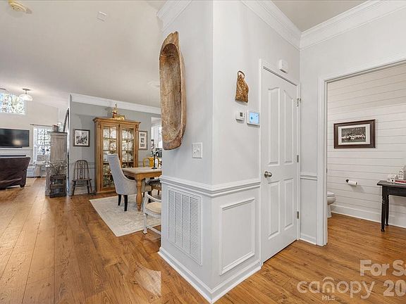 A fabulously-private, quiet location is where you will find this end unit townhome in the sought-after community of Tega Cay, SC. This lives like a single family home with spacious rooms throughout! A welcoming foyer greets you from the covered front porch, opening to generous dining and living areas. Proceed to the walls of windows in the two-story great room, awash in abundant light, to take in the beautiful views of the surrounding trees and nature as the seasons change. The gas fireplace with custom mantle provides cozy warmth when needed and plantation shutters enhance the windows for privacy. Adjacent is the fabulous kitchen and breakfast area with unobstructed views of the patio and backyard nature scene! Your bird feeders are welcomed here! The kitchen features a gas cooktop/oven, large pantry with custom barn doors, granite counters, tile backsplash, under cabinet lighting, abundant storage and moveable island! Under the stairs you'll also find great storage or a fun hideout for the littles! The second level offers a split bedroom plan for great privacy. The gracious primary suite provides ample space for a king-size bed, features dual walk-in closets and overlooks the treed backyard and green space. The en suite bath features a garden tub, separate shower, dual sink vanity and private water closet. The laundry room on this level offers great convenience too! Gorgeous new wood laminate flooring on main level. Most light fixtures have been replaced; ceiling fan added in great room; all new appliances in the past 5 years; new shiplap in the powder room.This is a much-loved and gently-used home. No pets! Take a short walk to the end of your driveway to get the mail or stroll up the walking path to the Tega Cay clubhouse for dinner, live music or a quick bite on the outdoor deck. Enjoy a round of golf, tennis or pickle ball right in the neighborhood or head down to Windjammer Park to watch the sun set over Lake Wylie. So much to do in the community OR, sit on your back patio, relax and do nothing at all! The beauty and joy of living in Tega Cay awaits you!