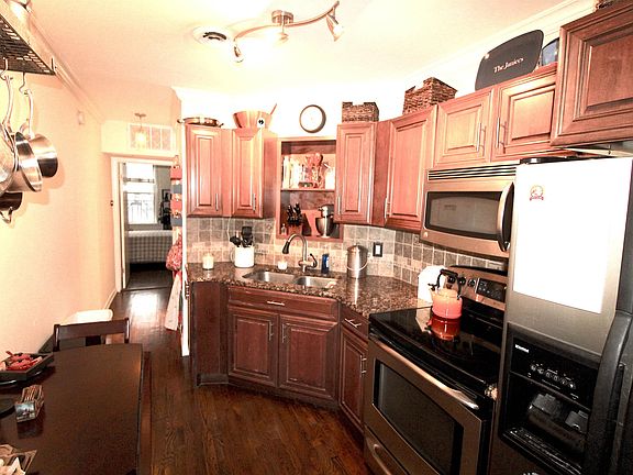Charming one bedroom condo surrounded by million dollar properties located in Hoboken's trendiest neighborhood. This apartment features a modern kitchen, cherry wood cabinets, stainless steel appliances, granite counter-tops, designer bath with double sink vanity and massive shower with glass enclosure, hardwood floors throughout, coin operated washer/dryer and storage in the basement - a common yard with BBQ. Just minutes to the Light Rail, fine dining, quaint pubs, shopping and NYC bus. Do not miss out on this gem! Available at November 15th.