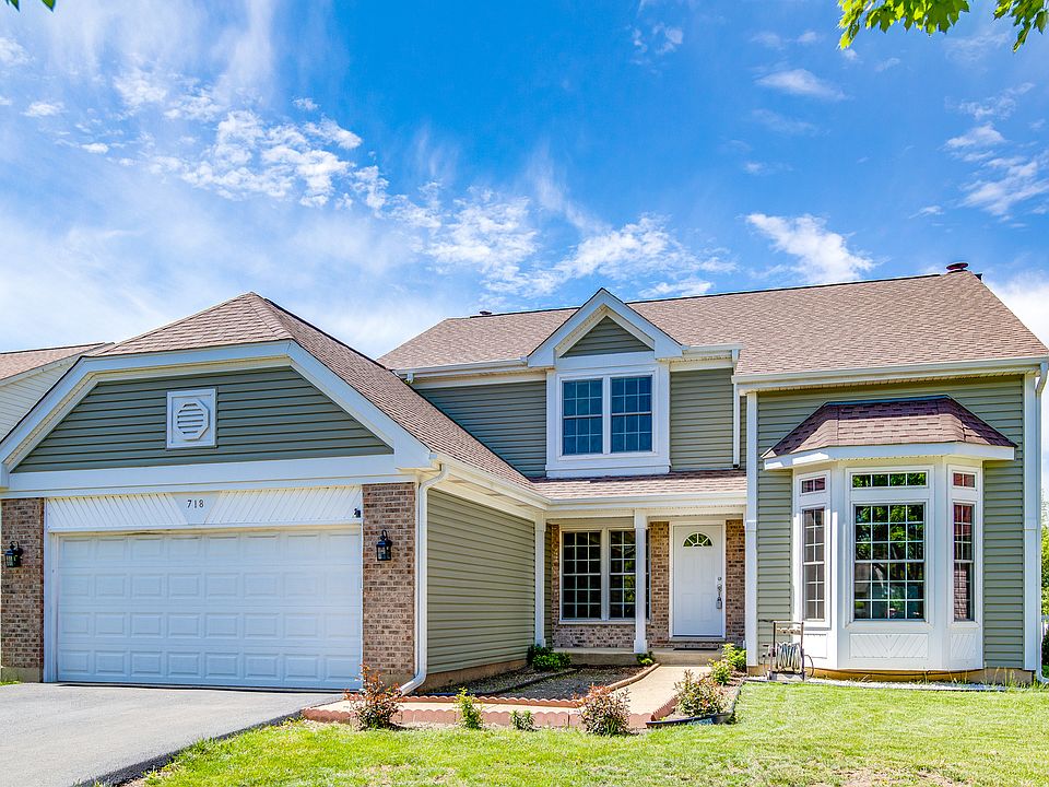 This meticulously well maintained home sits on a lovely interior lot and it is beautifully upgraded! Spacious 4 bedrooms, 2.1 baths, 2+ car garage, along with an office and den in the fully finished basement. Be impressed by the vaulted living room with tons of natural light, the separate dining room and especially by the gorgeous kitchen with custom cabinets, granite counter-tops, glass tile back splash and stainless steel appliances. The lovely family room features a marble fireplace and a patio door leading to your perfect maintenance-free deck. Upstairs you'll see the vaulted primary suite offering a whirlpool tub and shower, pretty tile, mirrors, fabulous lighting, double sinks, and a bright sky light. The additional bedrooms are whistle clean with bright windows and full closets. The basement is beautifully finished for extra entertainment space. The fully fenced yard also has a designated garden area. Modern lighting throughout w/today's light fixtures. Newer furnace, air, appliances and driveway. NEW roof and gutters in 2021, windows in 2018. Shed in 2020. This is a beauty! Walking distance to the water park, health club, park district and shopping. Hurry stop by today!