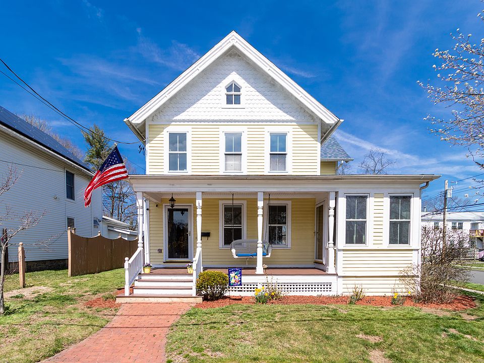 Come, see and fall in love with this adorable 1900s Colonial located on a quiet, tree-lined street in the charming Historic Downtown Stratford w/ a Level Lot. A short walk from the Metro North Station make this home a commuters dream! You can move right into this endearing 3 Bedroom home that offers a spacious Living Room with a plethora of natural light, stunning crown molding & original Hardwood Floors throughout, a chic formal Dining Room boasting beautiful sconces and a captivating Sunroom that can double as an Office or Den. The Kitchen features modern amenities & breakfast bar with a Main Level Powder Room that bears the W/D. A newly renovated Full Bathroom lies on the Upper Level beside the Bedrooms. A partially finished Third Level delivers a wonderful Bonus Room with water views, New Carpet & Attic space for additional storage. Gas Heat & Hot Water along with an active Solar System yields low cost and low maintenance. The sun drenched front porch, perennial gardens & wide plank floors give the feeling of a cozy Farm House. Find delight in relaxing on the porch swing each evening. There are many improvements to cherish here: New Refrigerator, Hot Water Heater, freshly Painted Interior- Front & Back Porch, Range Hood, Light Fixtures throughout, Landscaping, New Hardware & a New Stair Runner! Don't miss the detached 1 1/2 car Garage offering an abundance of space for a work area that hobbyist/contractors will love w/ Just enough yard and gardens to easily keep up with!