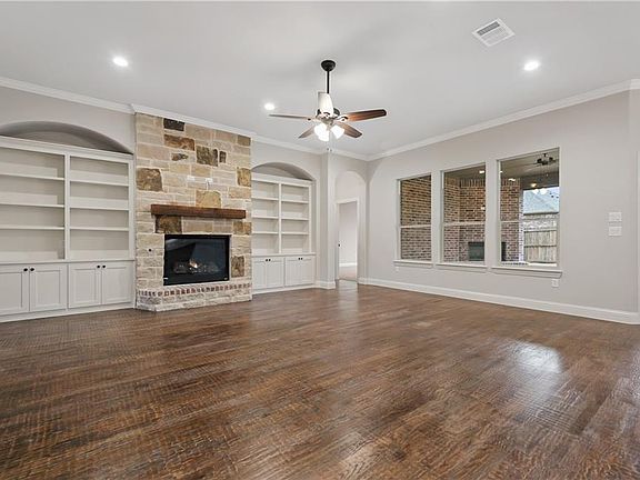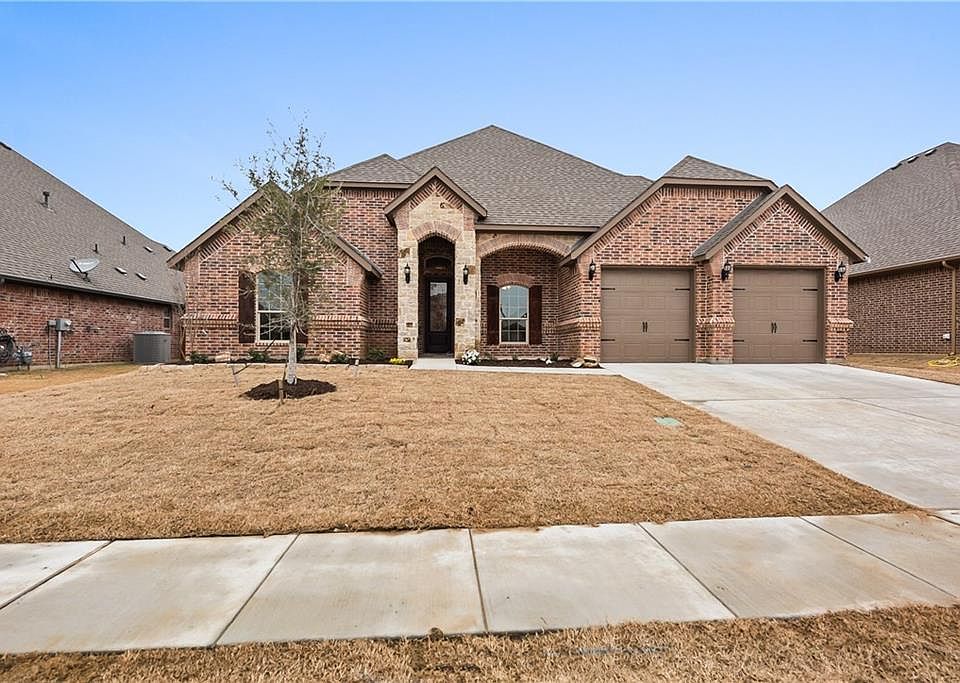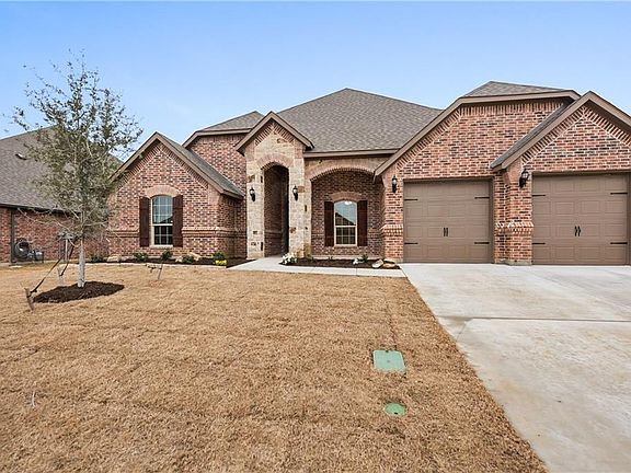 No expense was spared on this spectacular home in Sanger, TX! Amenities include towering ceilings, Low E vinyl windows and rich, hand-scraped hardwoods. Kitchen boasts stainless steel GE Profile appliances, custom cabinets with wood ventihood, 36 inch gas cooktop, tile backsplash, granite countertops, oversized island and pendant light fixtures. Large master bath with his & her vanities, large soaker tub, walk-thru shower with two shower heads and huge walk-in closet. Stone and brick fireplace with gas logs and remote control. Custom exterior brick and stone work. Large covered patio with wood-burning brick fireplace. 30-yr composite shingles, blown insulation in walls and attic and irrigation system.