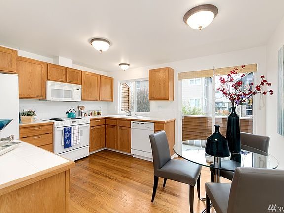 * Quality, cedar-shingle townhome on a quiet street near Greenlake, Aurora, Oaktree & Greenwood * Sun-drenched spacious living room features bay windows * Eat-in kitchen is loaded w/ counter space & opens to a private deck – great for grilling! * 2 Large bedrooms upstairs & a full bath * Lower level features a guest suite w/ private 3/4 bath & one car garage w/ full-size washer and dryer * Fenced, sunny back garden area that’s great for urban gardeners & outdoor gatherings! * No homeowner’s dues * New carpet in bedrooms and stairwells * Hardwoods in kitchen and 1/4 bathroom & pergo flooring in living room and hallways
