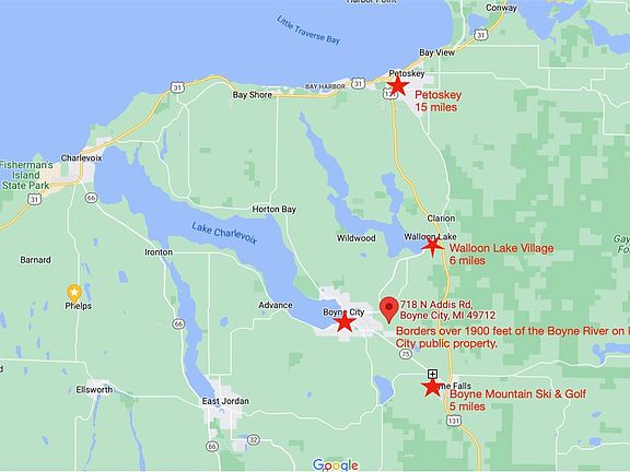 Beautiful 24 acre parcel just 3 miles from downtown Boyne City. Open meadows, hardwoods, and cedars. Over 1900 feet of the Boyne River accessible through Boyne City public land. Perfect place to build a home or just have for your up north getaway. The building currently on the property can be maintained for storage until you are ready to build. There are trails throughout the property. One that leads right down to one of the best fishing holes ever! Land some nice Salmon or Rainbow Trout. Kayak in to Boyne City. Ride your four wheelers on all of the trails. Plant a food plot and bring those big bucks out of the cedars! Your family will make many memories here!