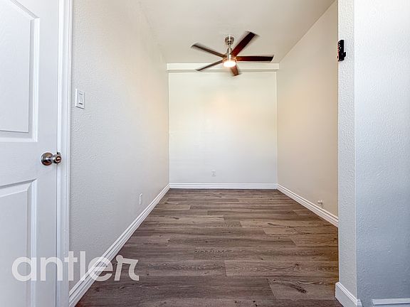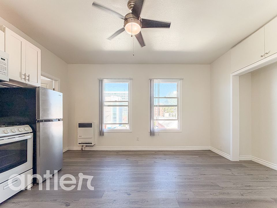 Solid brick buildingTile and wood flooringCeiling fanGas stoveVertical blinds