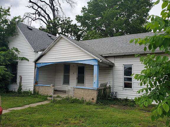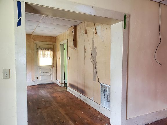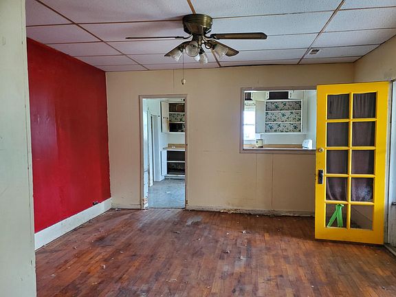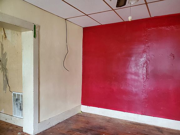 This fixer-upper is situated on a corner lot and boasts a fenced-in yard. It features two storage sheds, along with covered front and side porches. The interior includes some wood flooring and offers a generously sized kitchen, dining, and living room. Currently, the home has no electricity due to the fuse box being damaged by a lightning strike. Beneath the utility room lies a concrete cistern for water storage, about which the seller has no details.