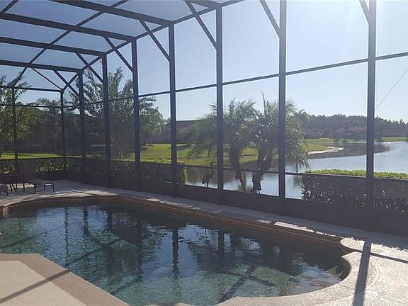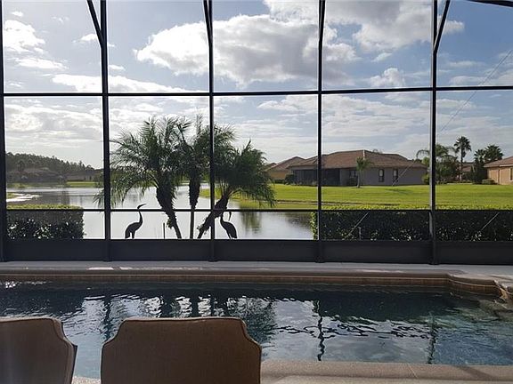 Beautiful 3 bedrooms and 3.5 bathrooms at Solivita with gorgeous water view, relax by the heated screened pool, watch the sunset, cook at the gourmet kitchen equipped with stainless steel kitchen-aid appliances, granite counters, kitchen island, kitchen nook,. Open plan with a spacious great room, separate dining room, additional bonus room/office room, custom plantation shutters, crown moldings, each bedroom with its own private bathroom and large closets. Master bedroom includes a bay window and tray ceilings. Master bath has walk-in shower and separate tub, laundry room with laundry tub, 2+ car garage and golf cart space. Gated community, recreation facilities and much more. 55+ community