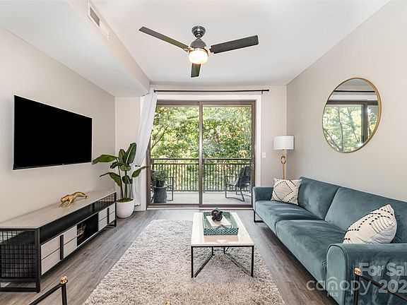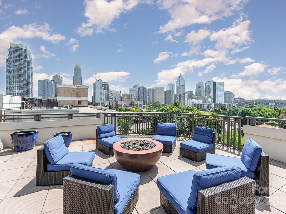 Fantastic opportunity to own in a convenient location with easy access to all that Uptown Charlotte has to offer! Enjoy breathtaking views of the Charlotte skyline from the rooftop terrace, complete with a gas fire pit and grilling area—perfect for relaxation or entertaining. Located on the 5th floor, this unit features an open floor plan and includes a private, covered outdoor balcony space. The kitchen boasts granite countertops & stainless steel appliances, seamlessly flowing into the dining area & bright living room. The primary ensuite offers views of the tree-lined street, a spacious walk-in closet & a double vanity in the bathroom.