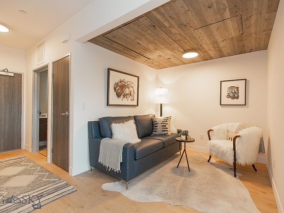 Consider this newer, lightly lived in condo off West Main Street in downtown Bozeman! Unit 408 is like no other in the Sobo Lofts - It's design enhancements such as barnwood ceiling in the living room nook and along the kitchen island give it a personal and luxury flare that set it apart from most Bozeman condos. From its fourth floor perch, one can enjoy Bridger mountain range views and alpenglow sunsets from anywhere inside or out on the covered balcony. The unit also has an open concept kitchen and living room providing plenty of space for guests, a roomy bathroom with walk-in shower, and a nice sized bedroom with walk in closet. Included with the sale is a parking spot in the heated garage and a storage unit.