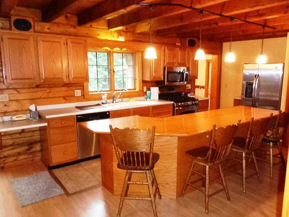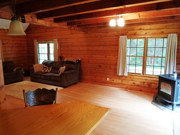 PRICE REDUCED! Make yourself at home nestled in the woods. This 3 bedroom log cabin on 5 Acres, with a fully fenced-in back yard, 2 Full baths with washer /dryer on main floor. Partially finished cellar for extra living area etc. 2 Stall detached garage with carport for additional coverage. Make an appointment today to see your dream log cabin in the woods.